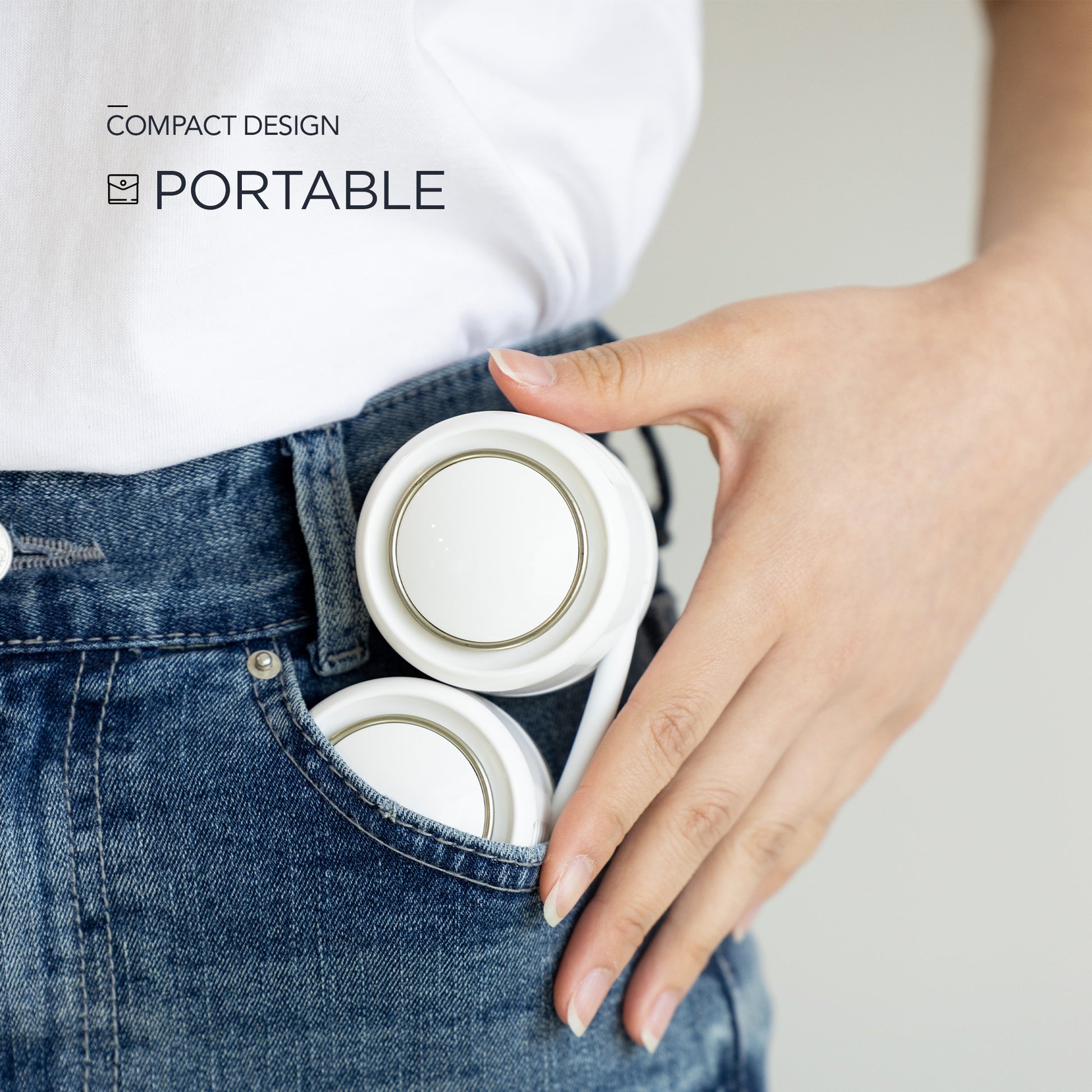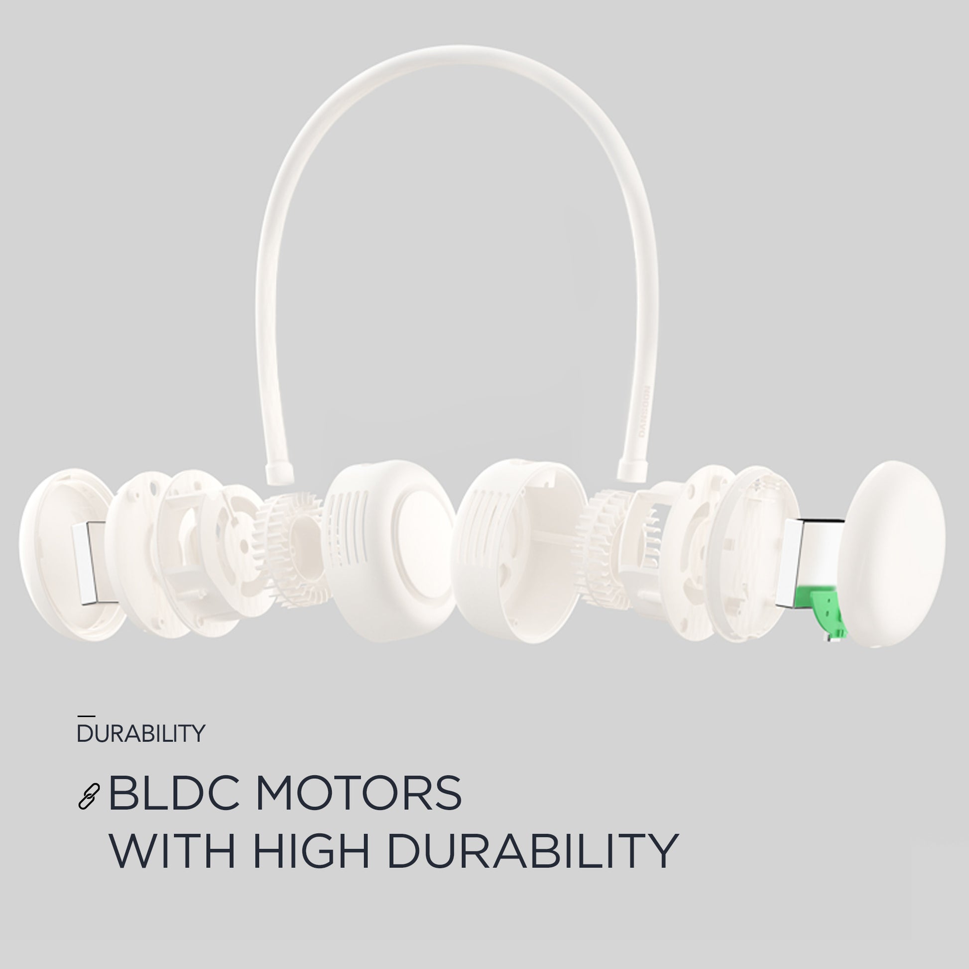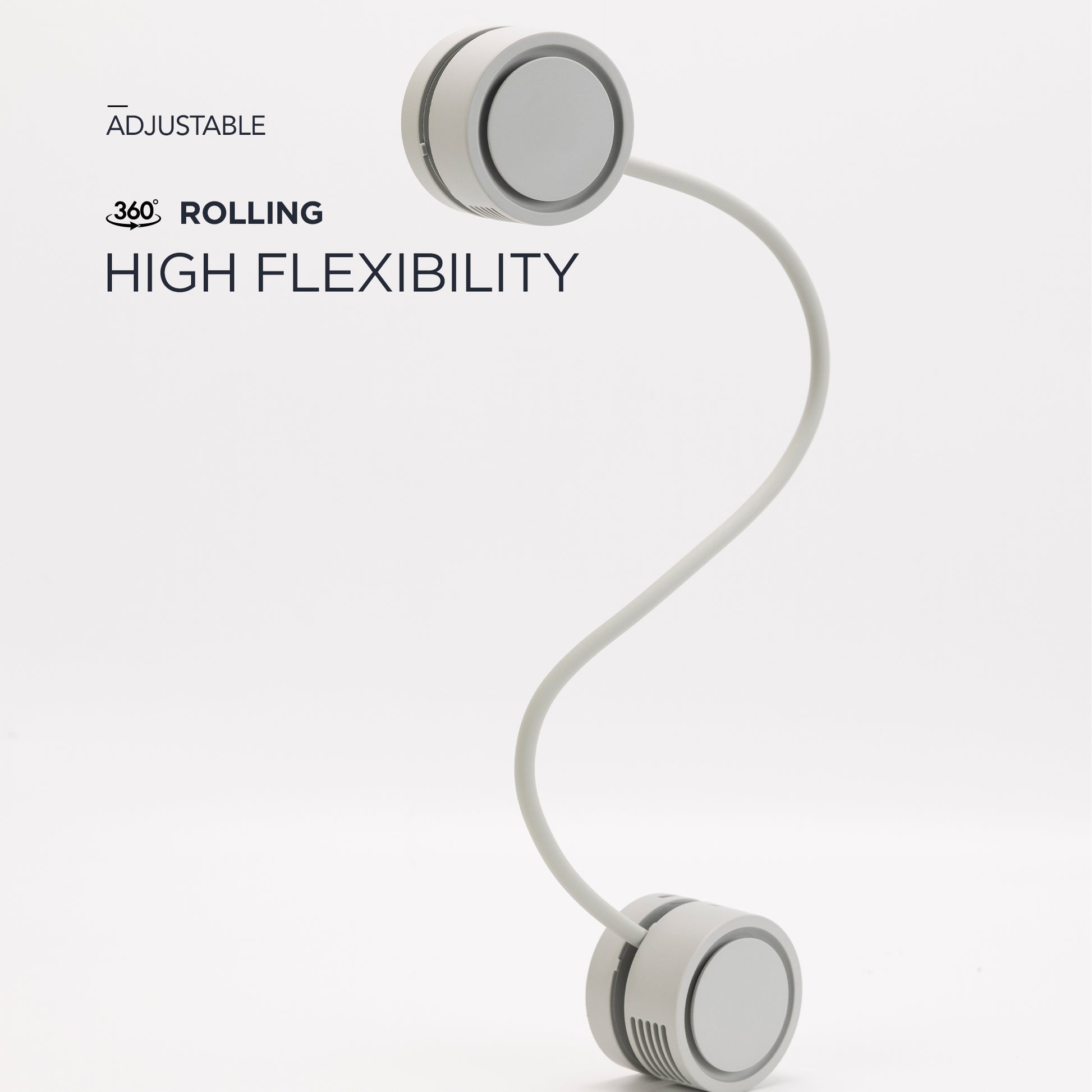 The Bladeless Neckband Rechargeable Portable Fan has a multiple function and stylish design. It is a hands-free item that can be hung around the neck, and the bladeless fan reduces the risk of getting hair or dust stuck in the fan. The bladeless technology with BLDC (Brushless DC electric) motor gives powerful wind, uses less energy, and makes low noise. Unique colors and stylish designs that were not found in existing neckband fans will upgrade your fashion. Using a flexible silicone band, the direction of the air outlet can be freely adjusted, allowing for customized wind, and it can be bent small, making it easy to carry.